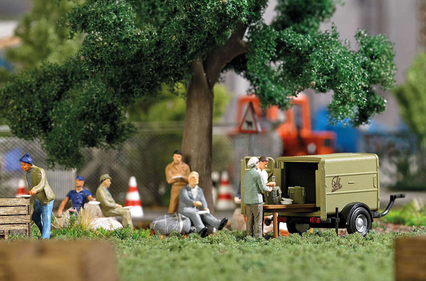 Zwei Erntehelfer bei der Vesperpause sowie Versorgungsanhänger mit geöffneten Türen. Mit Tisch, Wärmebehälter, Stehtischen und Geschirr.