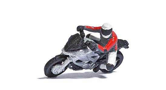 Modernes Motorrad (silber) mit Fahrer in rasanter Kurvenfahrt. Mit 3 Leitplanken und 8 Begrenzungspfosten.