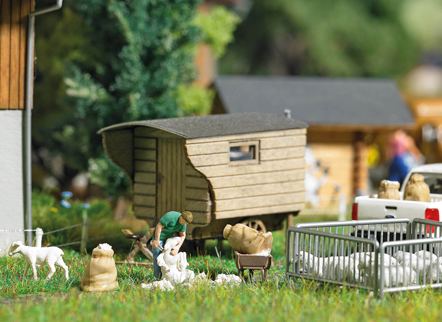 Schafscherer, der ein Schaf schert und ein geschorenes Schaf. Mit Schafpferch sowie Schubkarren und Säcken für die Schafwolle.