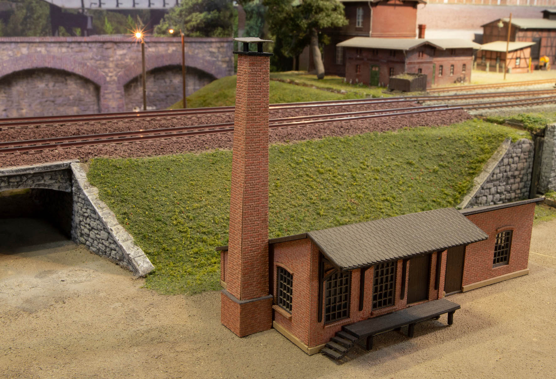 Viereckiger, gemauerter Schornstein, hellrote 3D Ziegel, passend zu kleinen Werkstatt- und Fabrikgebäuden.