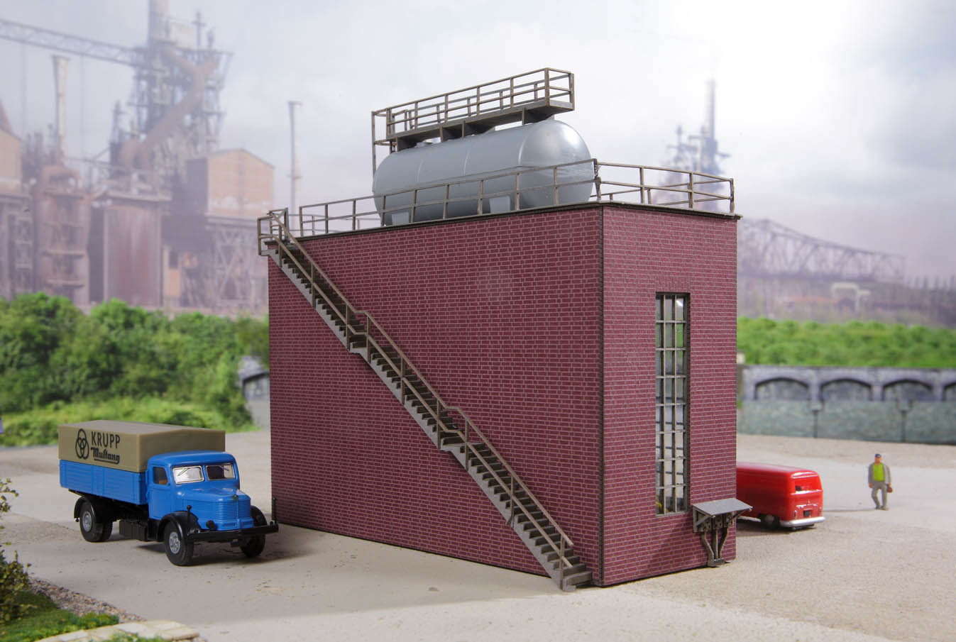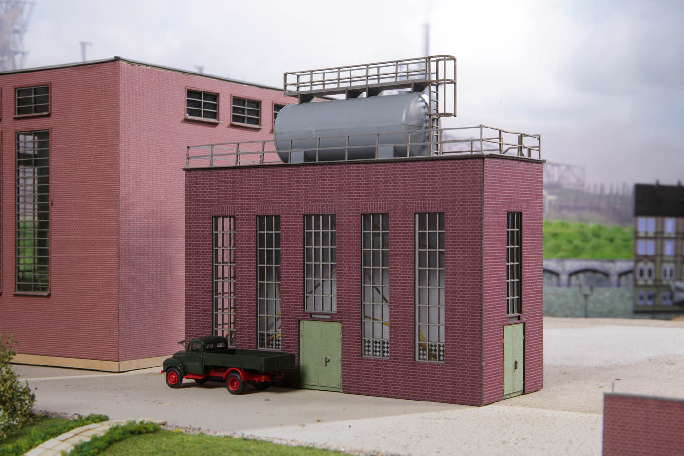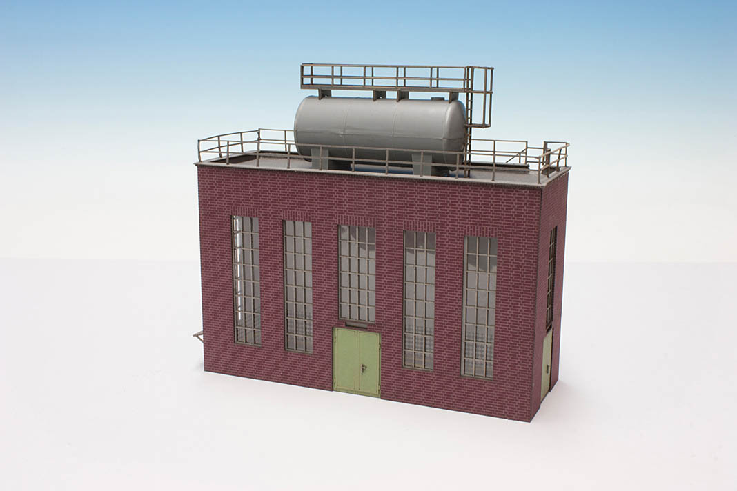 Kleines Fabrikgebäude mit Behälter auf dem Dach, Maße in mm: L 155 x B 66 x H 145