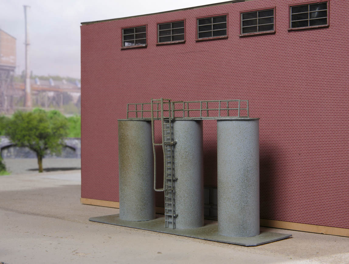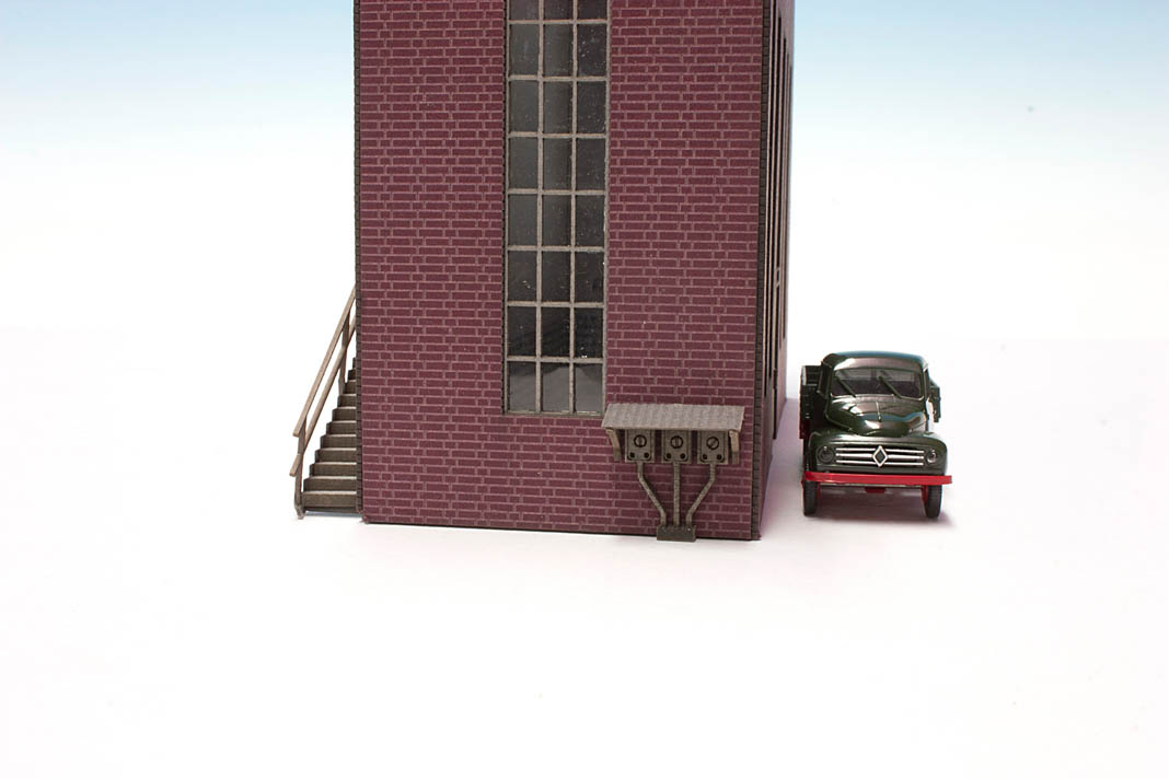 Rückseite mit angesetzter Betontreppe, das Vorbild steht auf der Kokerei Hansa, in ihr ist die Anthracenöl-Regenerierung untergebracht.