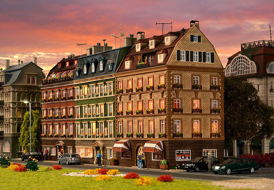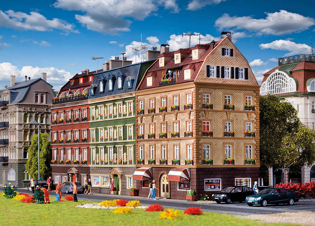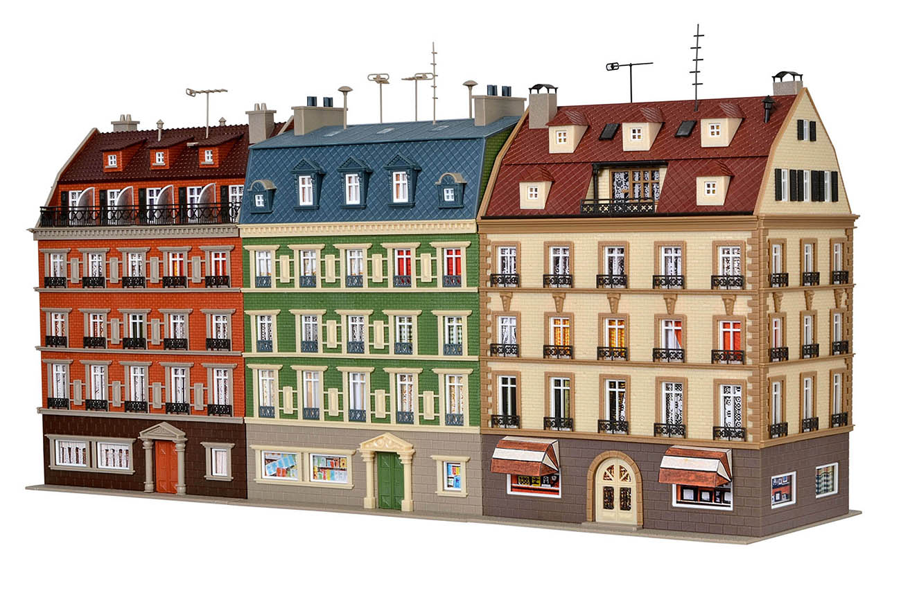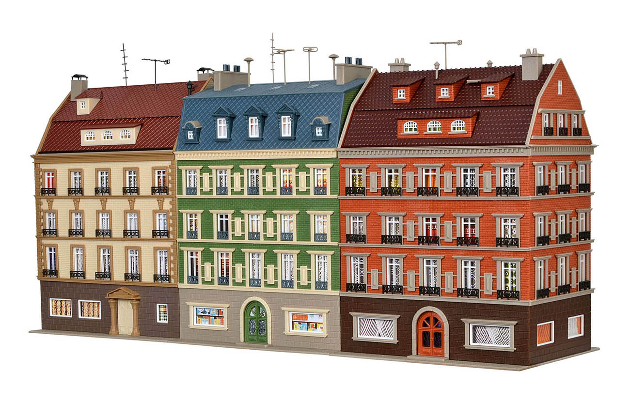 Mit diesem Häuserblock können Sie einen ganzen Straßenzug gestalten. Die Gebäude sind mit vielen Details ausgestattet, z. B. Eisengitterverzierungen, zierlichen Balkonen, Dachterrassen und vielem mehr.