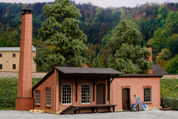 Bausatz H0 (1:87), Maße in mm: Länge 155, Breite 105, Höhe 50, Maße Kamin: Länge 17, Breite 17, Höhe 120