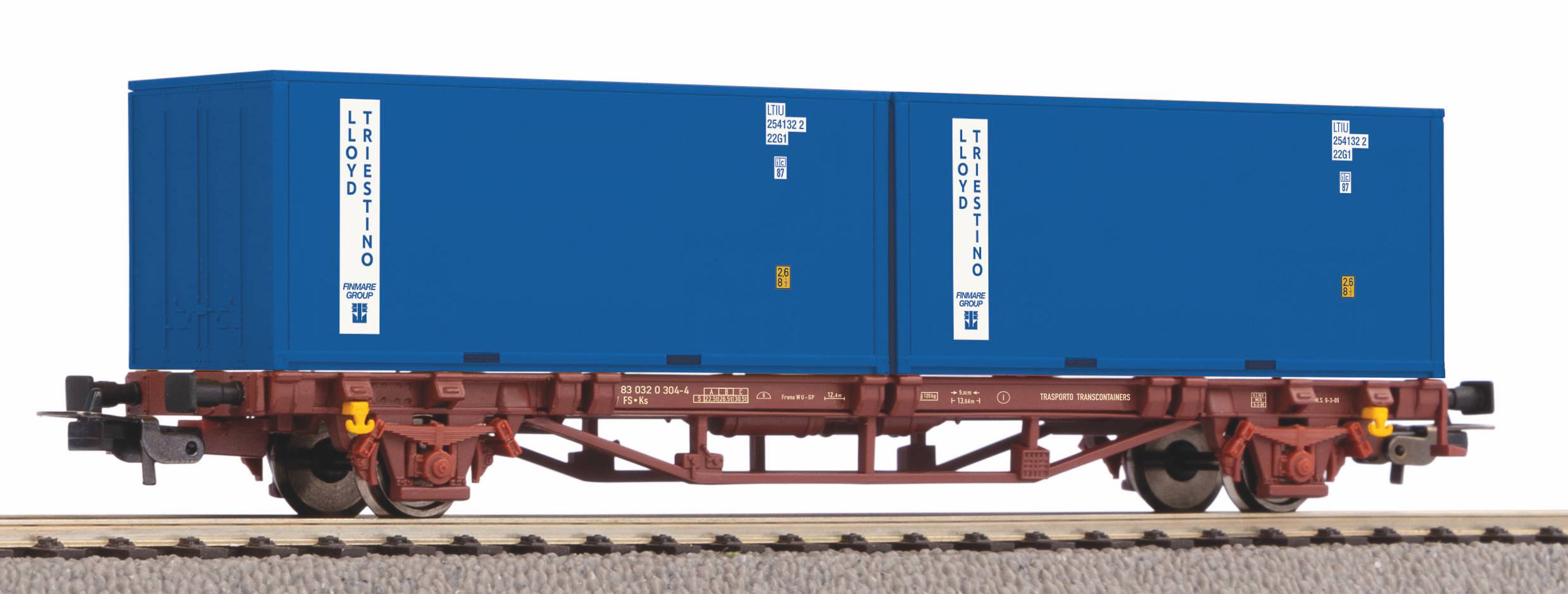 Neuheit 2023: Druckvariante des Containertragwagens der FS in Epoche IV mit zwei 20' Containern.