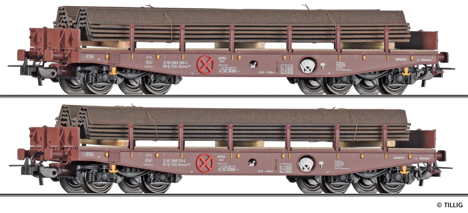 Güterwagenset der TSS Cargo a.s. (CZ), bestehend aus zwei Schwerlastwagen Rmms 662 beladen mit Spundwänden, Ep. VI