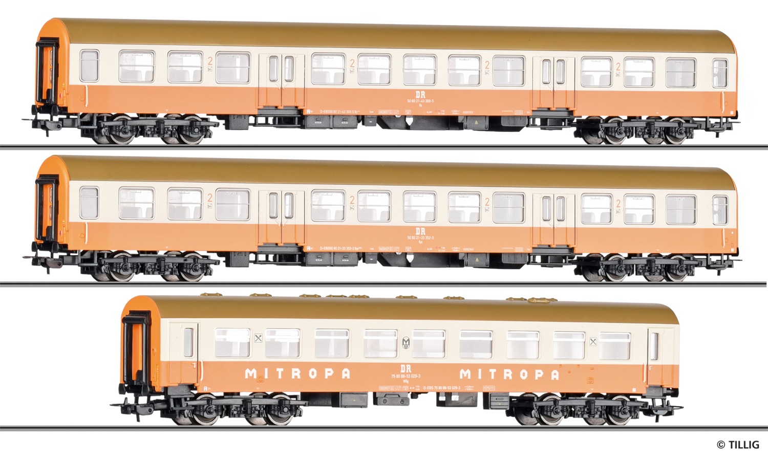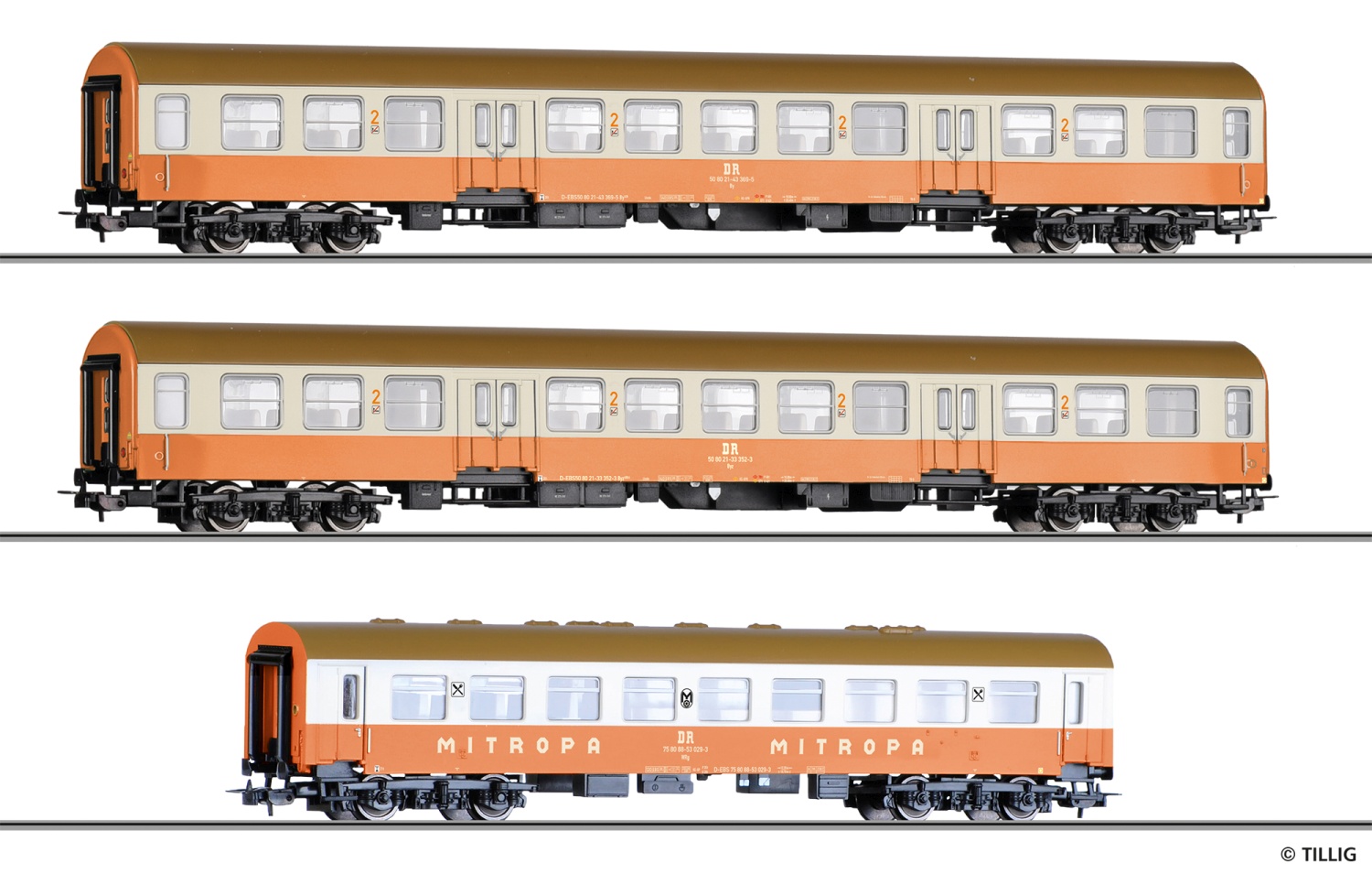 Reisezugwagenset „Museums-Städteexpress Erfurter Bahnservice GmbH“, bestehend aus zwei Reisezugwagen Bmh, Bauart Halberstadt und einem Buffetwagen Wgr, Teil 1, Ep. VI