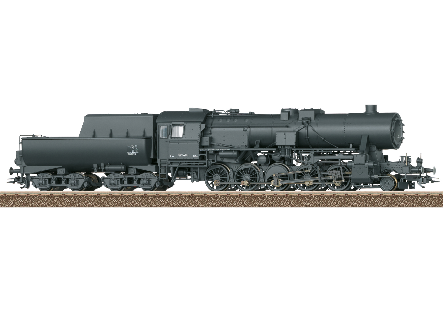 Schwere Güterzug-Dampflokomotive Baureihe 52 mit Wannentender 2´2´T30. Deutsche Reichsbahn (DR). Schwarzgraue Grundfarbgebung. Ohne Windleitbleche. Mit Frostschutz-Verkleidung der Luftpumpe und verkleidete Schmierleitungen. Vorlauf-Radsatz mit Vollrädern. Lok-Betriebsnummer 52 1400. Betriebszustand um 1943/44.