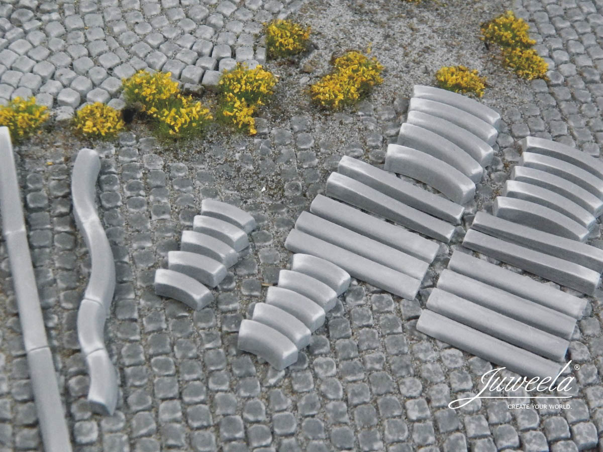 - vorbildgerechte Größe, 2 Kurvenradien mit Innen/Außen, Absenkungen links/rechts, abgesenkte Bordsteine