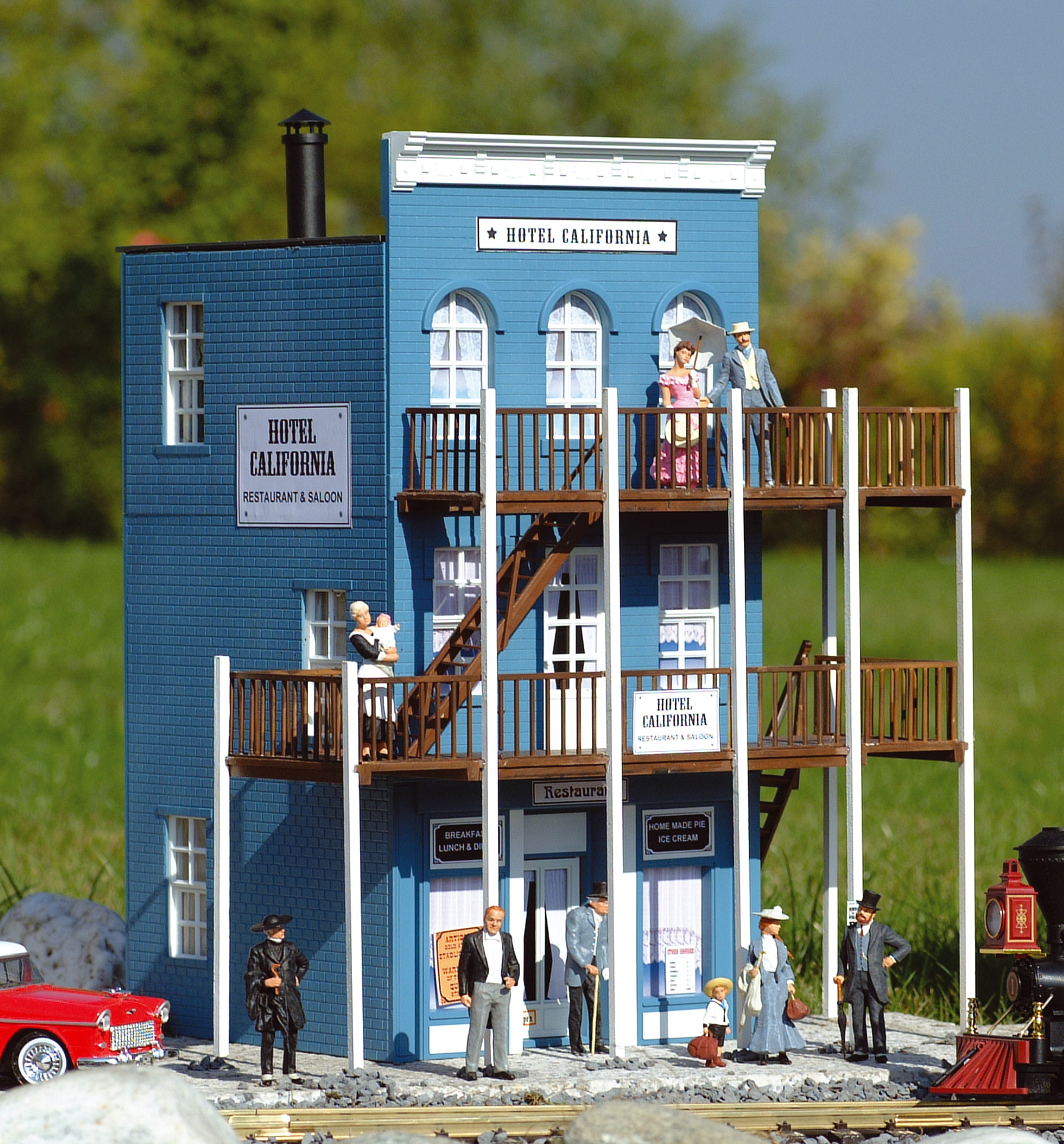 Die Zimmer in den oberen Stockwerken erreichen die Gäste über außen liegende Treppen, die dem Gebäude sein interessantes Aussehen verleihen. Erbaut Anfang des 20. Jahrhunderts bereichert das Hotel hervorragend im Stil des Westens der USA gestaltete Anlagen. Dem Bausatz liegen Grundplatten bei.