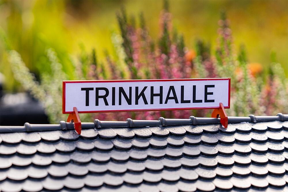 Durch die offene Theke blickt man direkt auf Flaschen, Gläser und kleine Snacks. Vor dem Kiosk sorgt der eingezäunte Biergarten mit weißen Gartenstühlen, Tischen und blau-weißem Sonnenschirm für gemütliche Atmosphäre. Liebevolle Details wie Getränkekisten, ein Zigarettenautomat und nostalgische Reklameschilder runden die Szene stimmungsvoll ab!