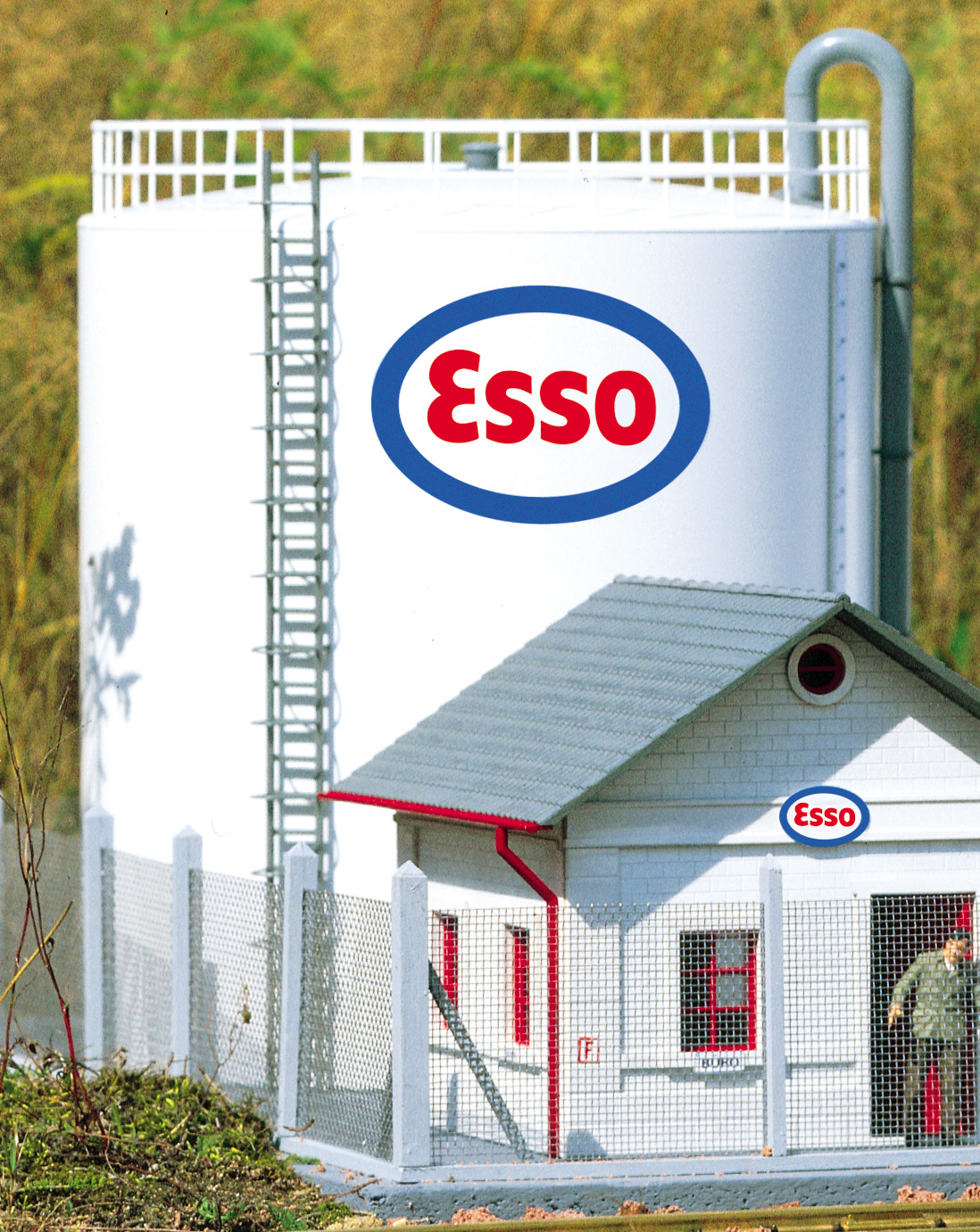 Die beiden Dieseltanks haben auf dem Dach eine umlaufende Reeling, eine Zugangsleiter und ein Befüllungs- und Entleerungsrohr. Aufkleber für die Gestaltung des "Esso"-Tanklagers liegen dem Bausatz bei. Bei Bedarf können die Grundplatten #62005 (3 Bodenplatten-Sets) eingesetzt werden.