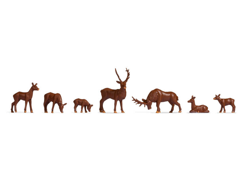 Das Figuren-Set beinhaltet 7 „Hirsche“. 2 der Tiere haben ein großes Geweih auf dem Kopf. Ebenfalls haben 3 der Figuren ihren Kopf nach unten gesenkt und fressen das grüne, saftige Gras. Einer der „Hirsche“ liegt auf dem Boden. Bei den „Hirsche“ sind 5 Jungtiere dabei, die den Wald erkunden.