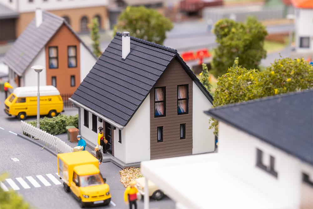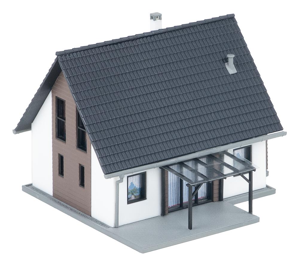Modernes Einfamilienhaus mit grau-braunen Fassadenelementen, Wintergarten, Terrassenüberdachung und feinem Ätzteilegeländer. Dank durchdachter Konstruktion besonders einfach zu bauen – ideal auch für Einsteiger.