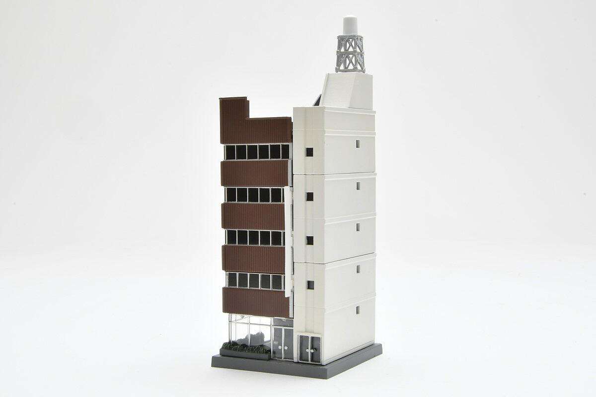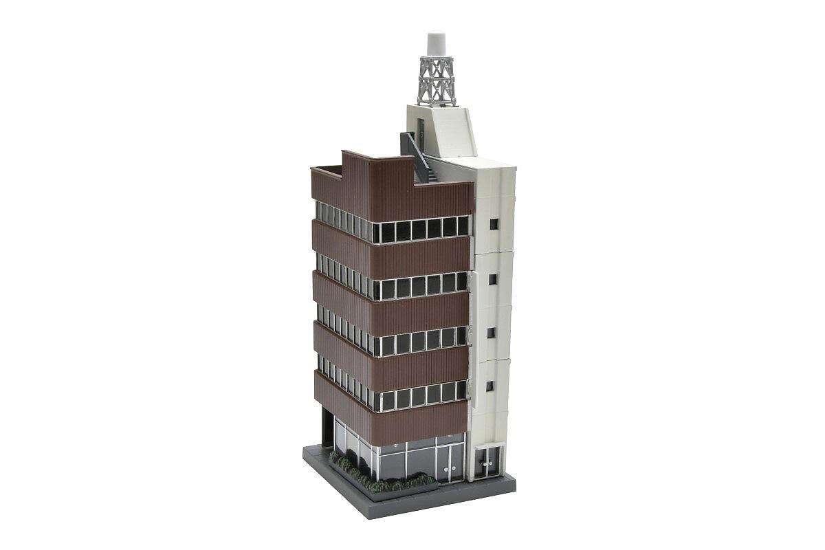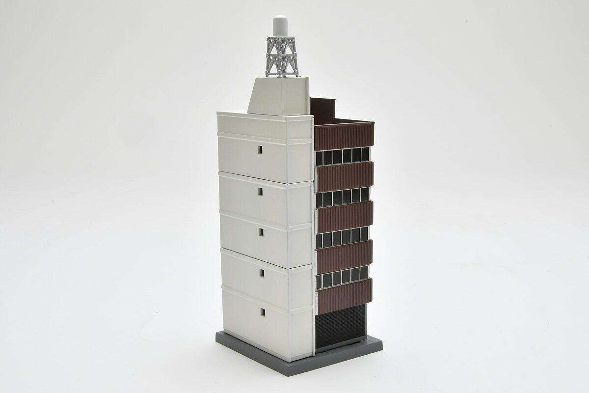 Hochausgebäude mit Dachturm, Treppen, Wassertank und Decals.