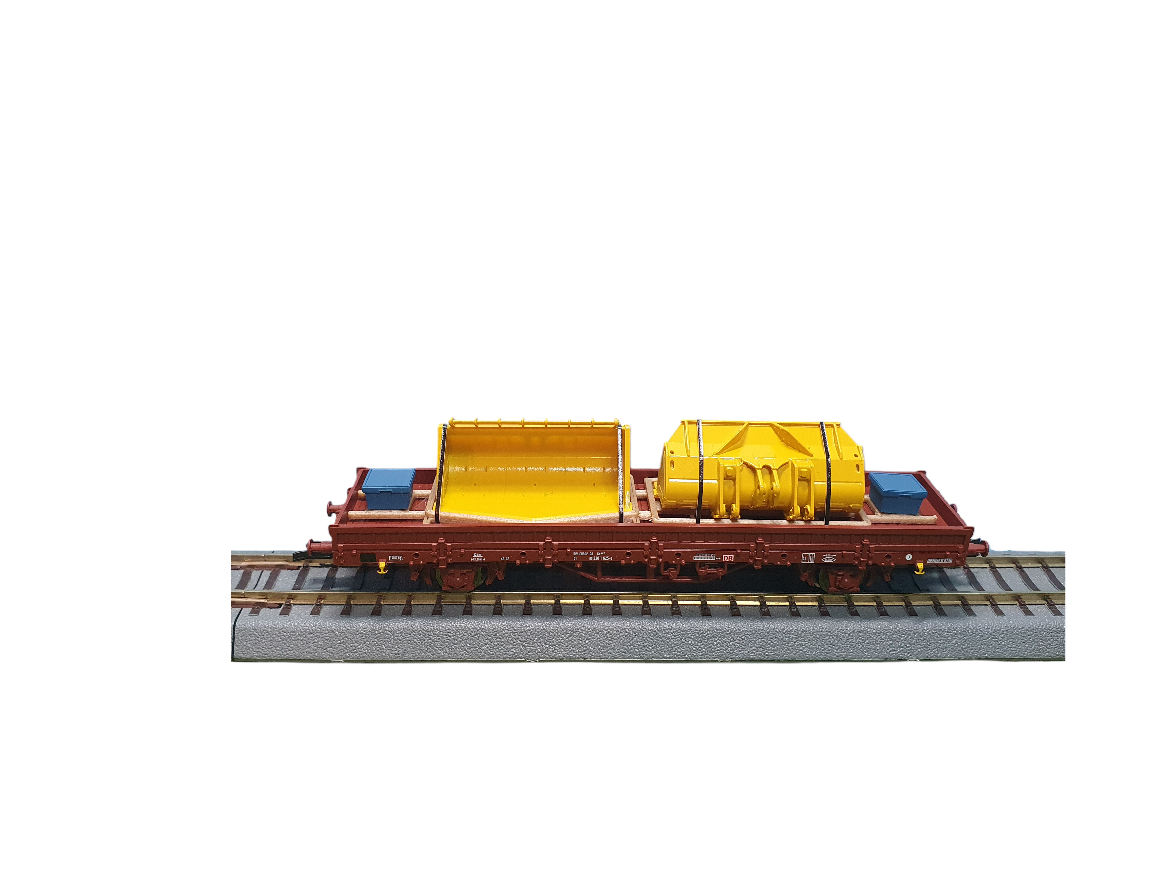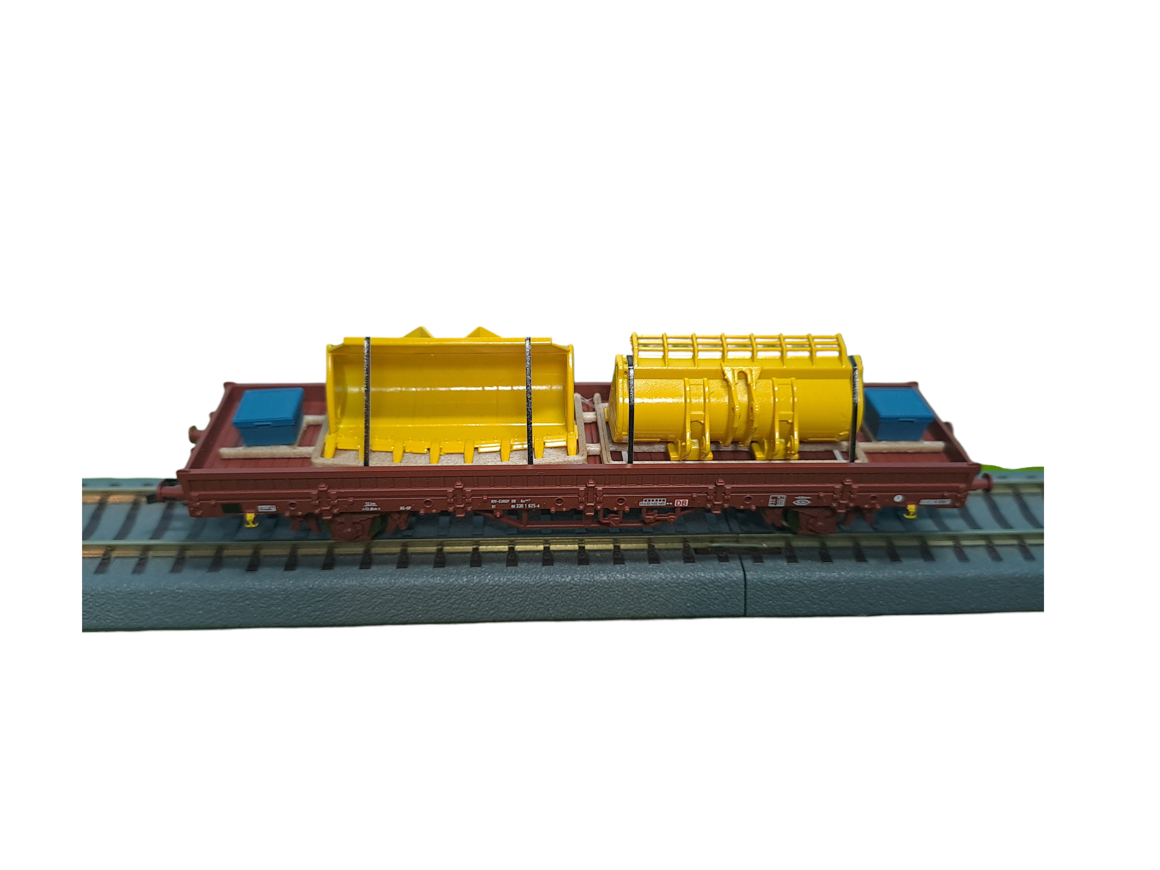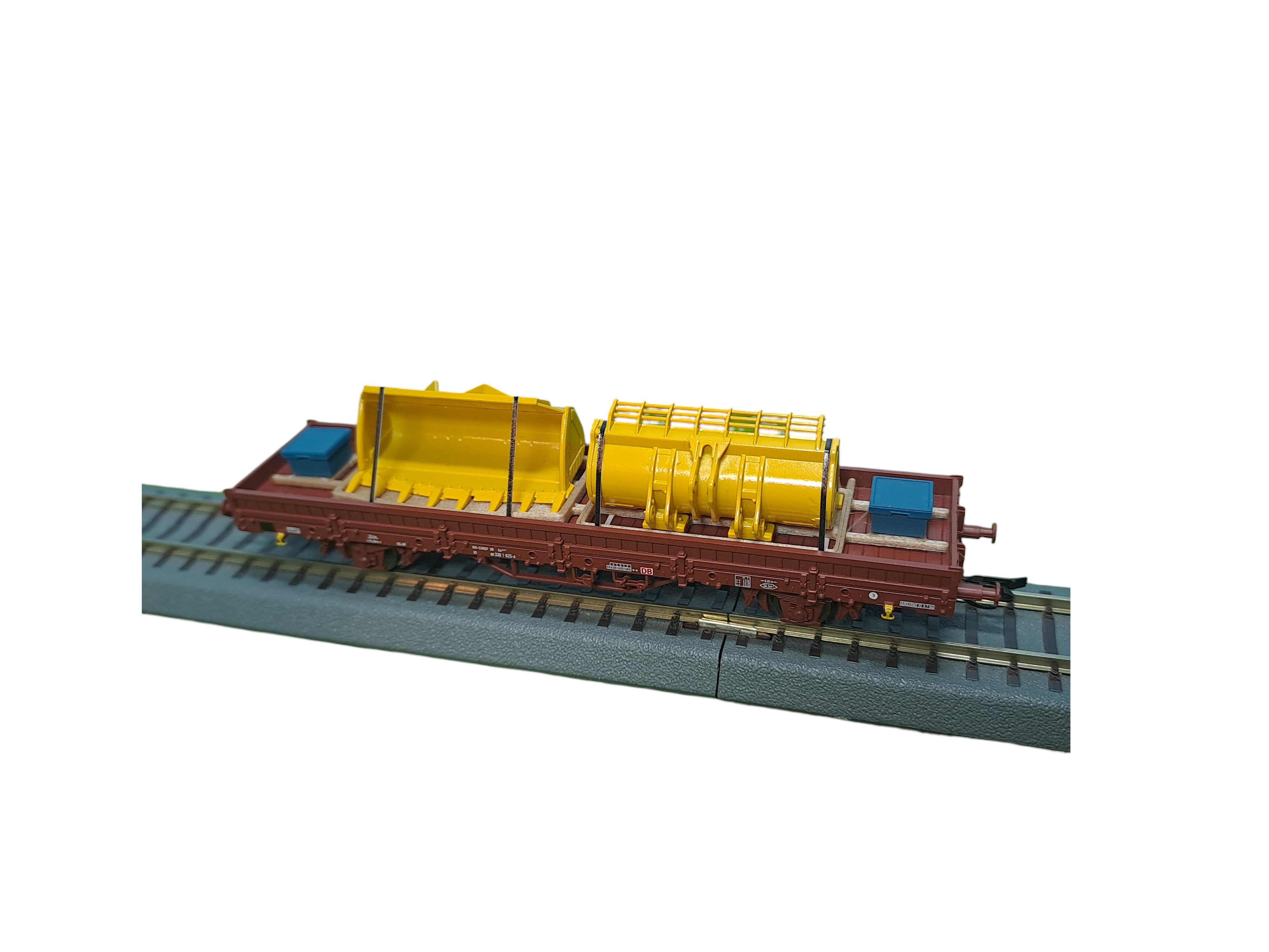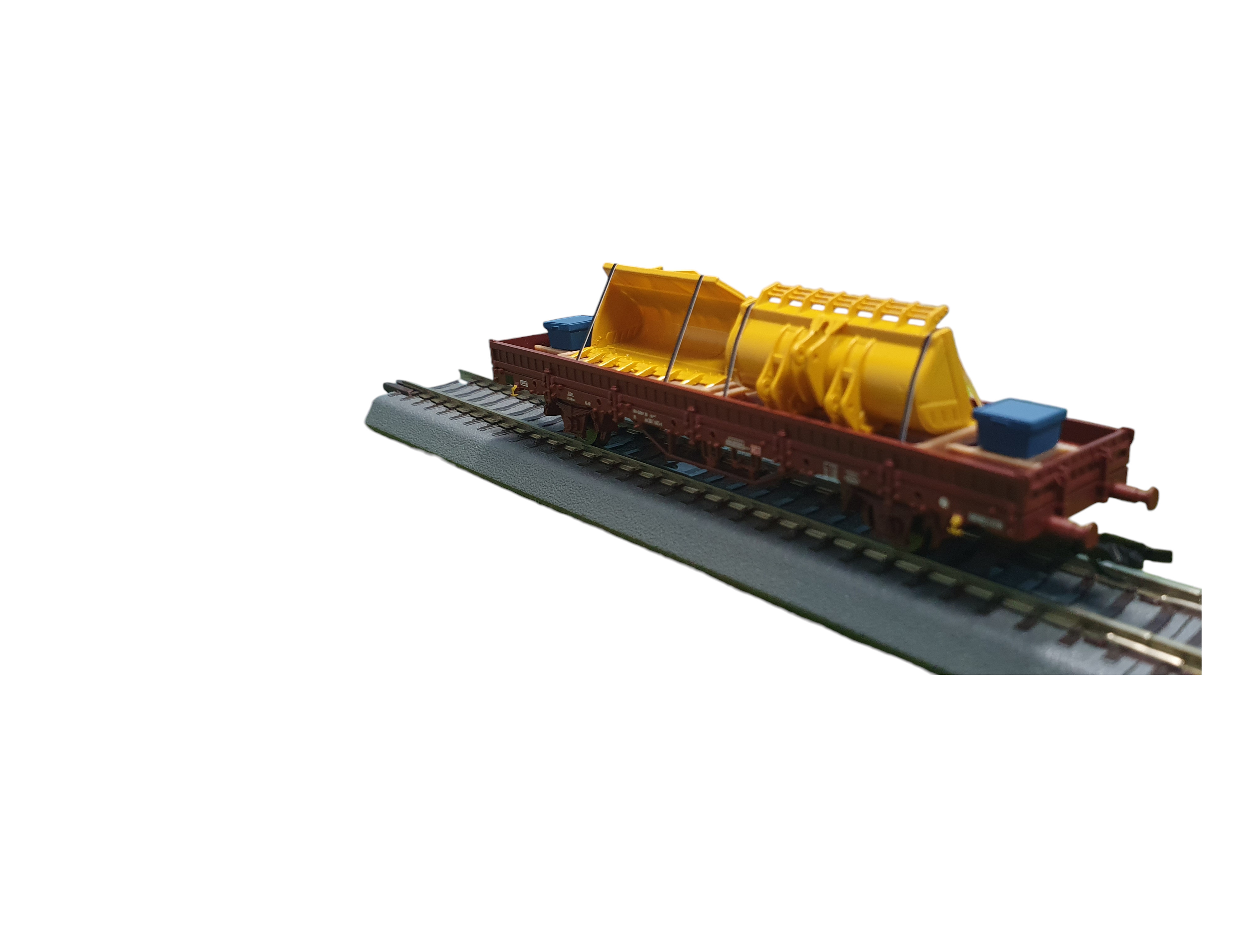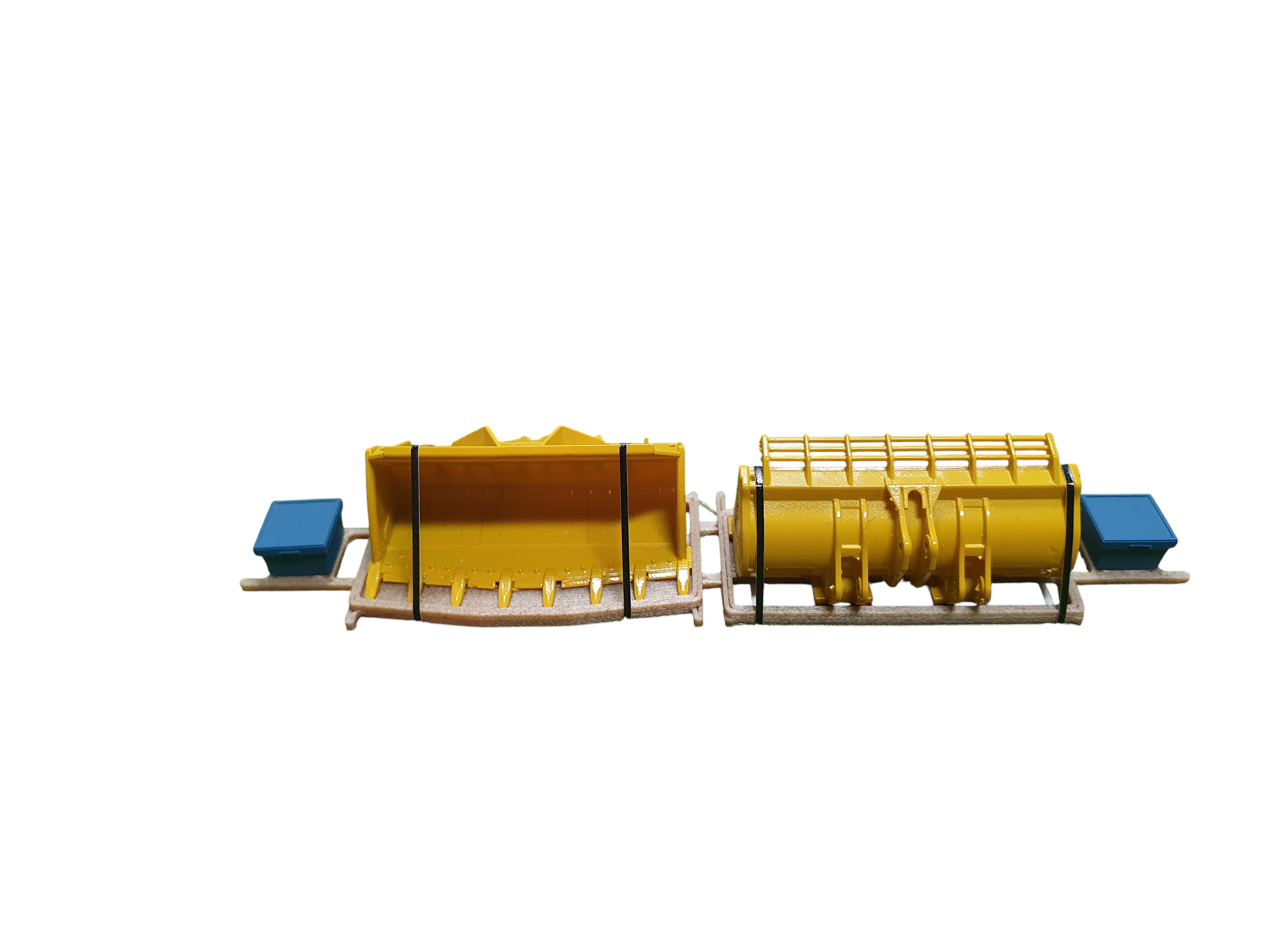 TT Ladegut – zwei gelbe Baggerschaufeln mit zwei blauen Werkzeugboxen und schwarzen Zurrgurten auf Holzrahmen (Nachbildung)