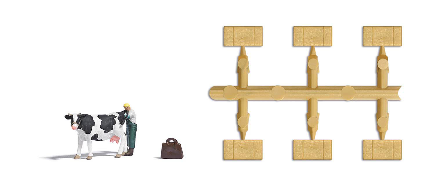 Besamungstechniker bei der Arbeit. Mit Kuh und Heuballen.