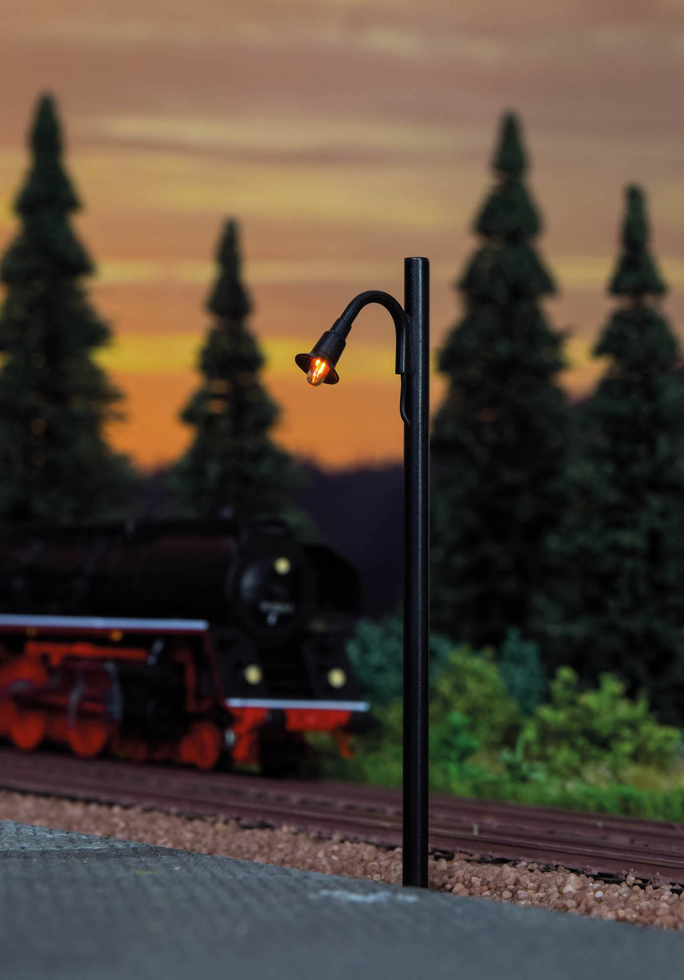 Eine beleuchtete Modellbahnanlage lässt nicht nur Kinderaugen leuchten. Die richtige Beleuchtung ist für das Gesamtbild Ihrer Anlage ein ganz wesentlicher Bestandteil. Eine gut gestaltete Modellbahnleuchte muss trotz aller Rücksicht auf die maßstäbliche Verkleinerung so beschaffen sein, dass man ihre Hauptkonturen auch noch aus größerer Entfernung erkennen kann. Modellbahnleuchten von Viessmann setzen nicht nur echte "Glanzpunkte", sondern sie glänzen auch durch hochwertige Verarbeitung und trotz feinster Detaillierung mit robuster Qualität.