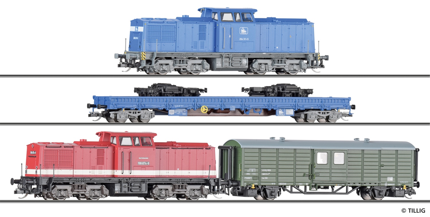 Tillig 01080 - TT - 4-tlg. Güterzug Diesellok BR 198 'HSB-Loküberführung', Press, Ep. VI