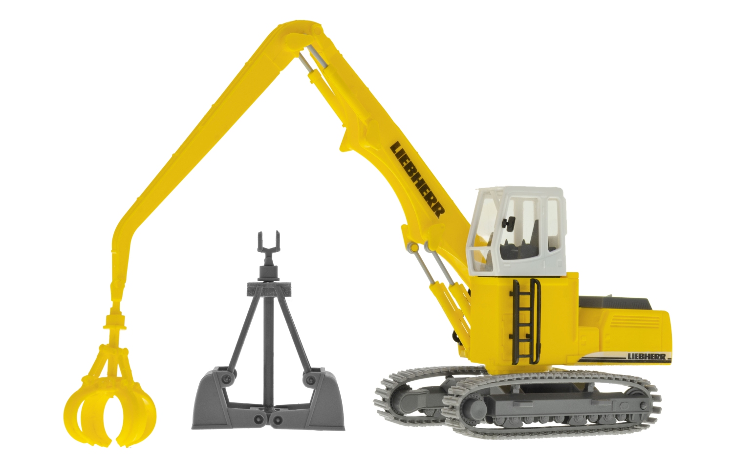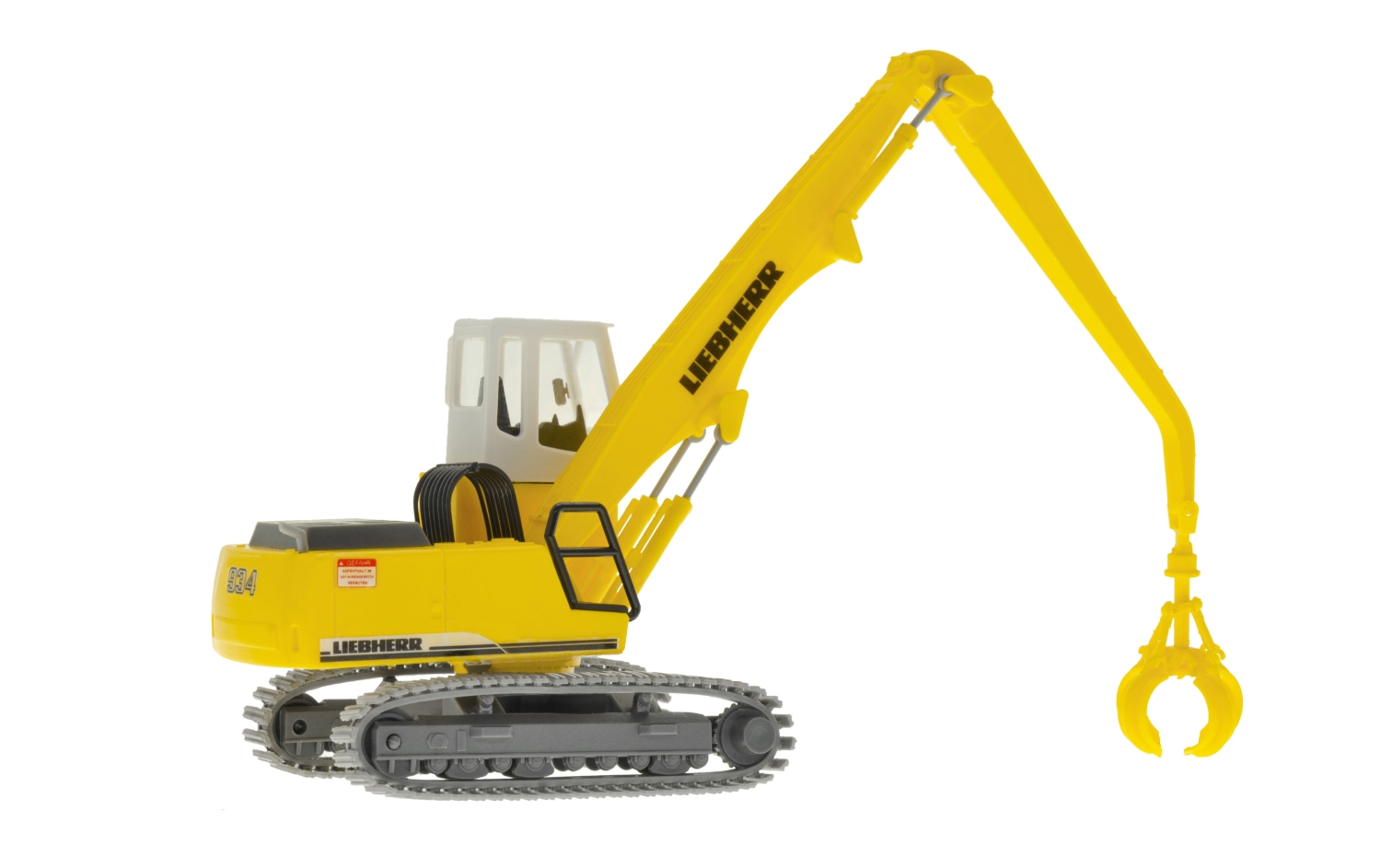 Liebherr R 934 Litronic HD-SL Raupenlademaschine mit Greifer. Vorbilddaten: Fassungsvermögen 0,8 m³, H 12 m, Reichweite 14,5 m, Tiefe 6,5 m, Einsatzgewicht 37 Tonnen, Höchstgeschwindigkeit 3,5 km/h. Motor: LH D924TIE, 197 PS, hergestellt in Frankreich 1998 – 2003.